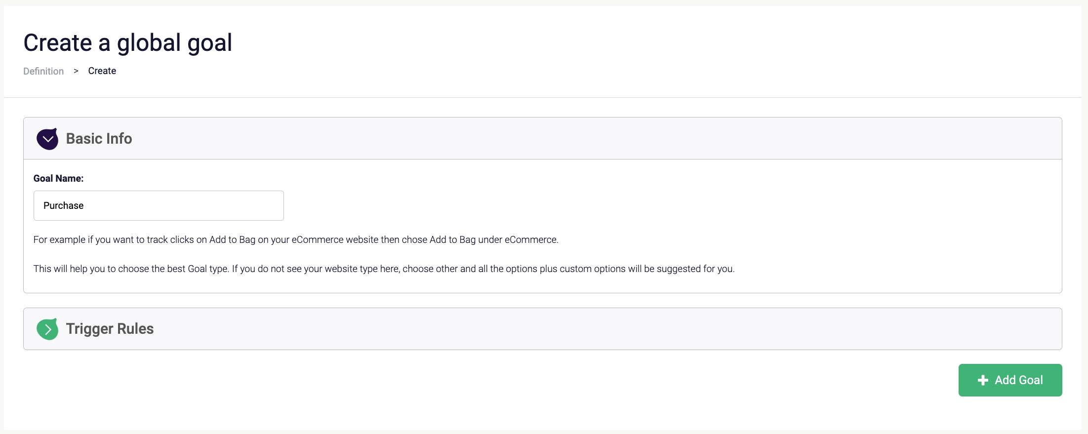 Under Basic Info set a name for your goal, for example Purchase.